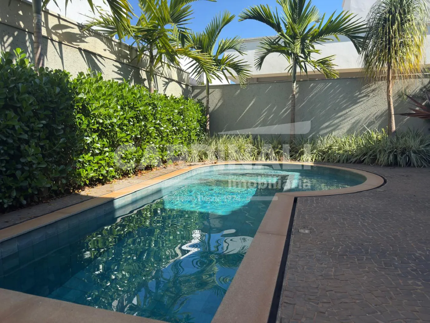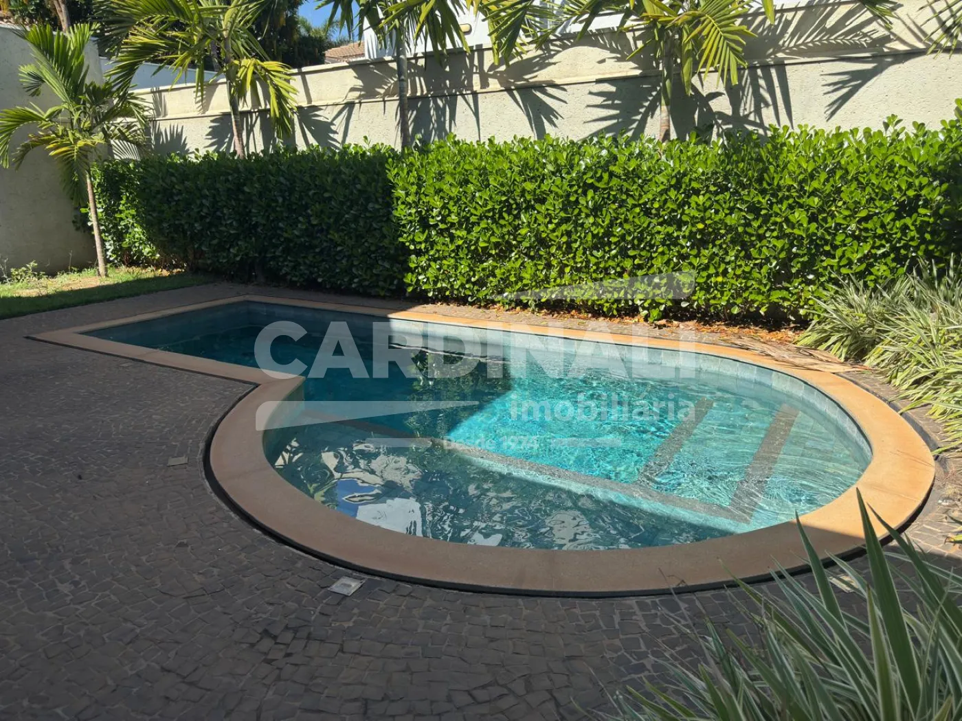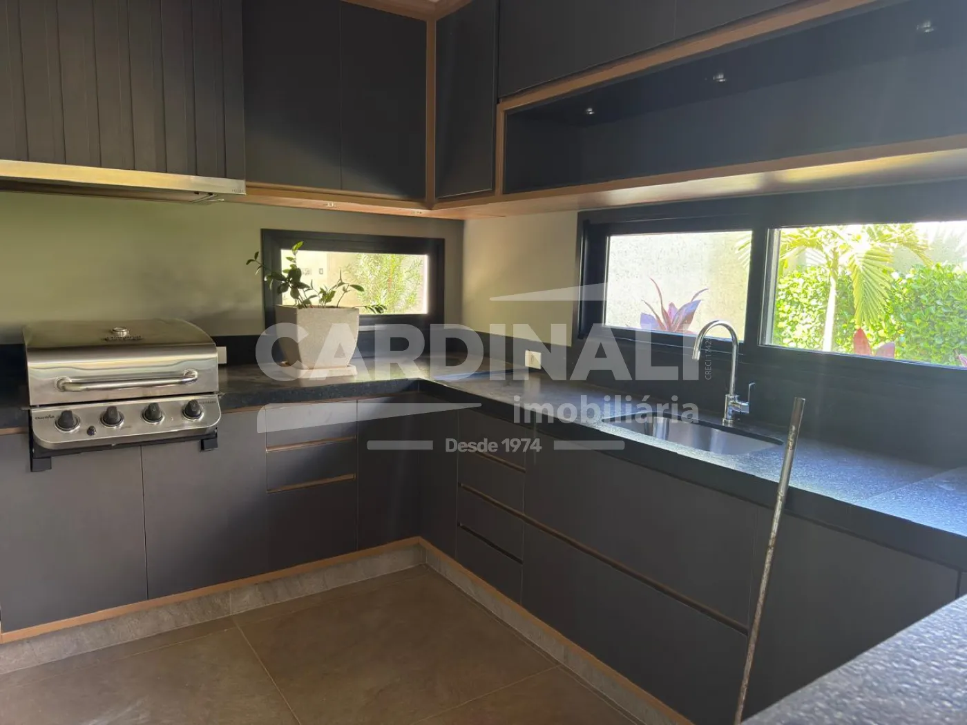 Imóvel oferece 03 suítes repletos de armários e ar condicionados, camas, de solteiros e de casal, sala ampla em 02 ambientes com pé direito alto, painel com TV, sofás, mesas e cadeiras, cozinha toda planejada com armários, fogão, micro-ondas, lavabo, escritório com armários, corredor com roupeiro, lavanderia com armários e máquina lava e seca, área gourmet com churrasqueira, armários, banheiro externo para piscina, quintal com piscina grande, paisagismo, garagem coberta para 02 carros e mais 02 descobertos.