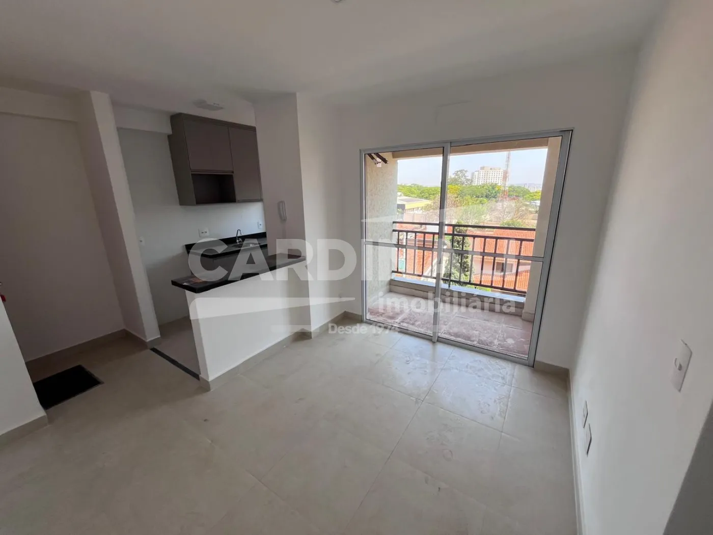 Sala com saída para uma sacada ensolarada, oferecendo vistas agradáveis e espaço de descanso