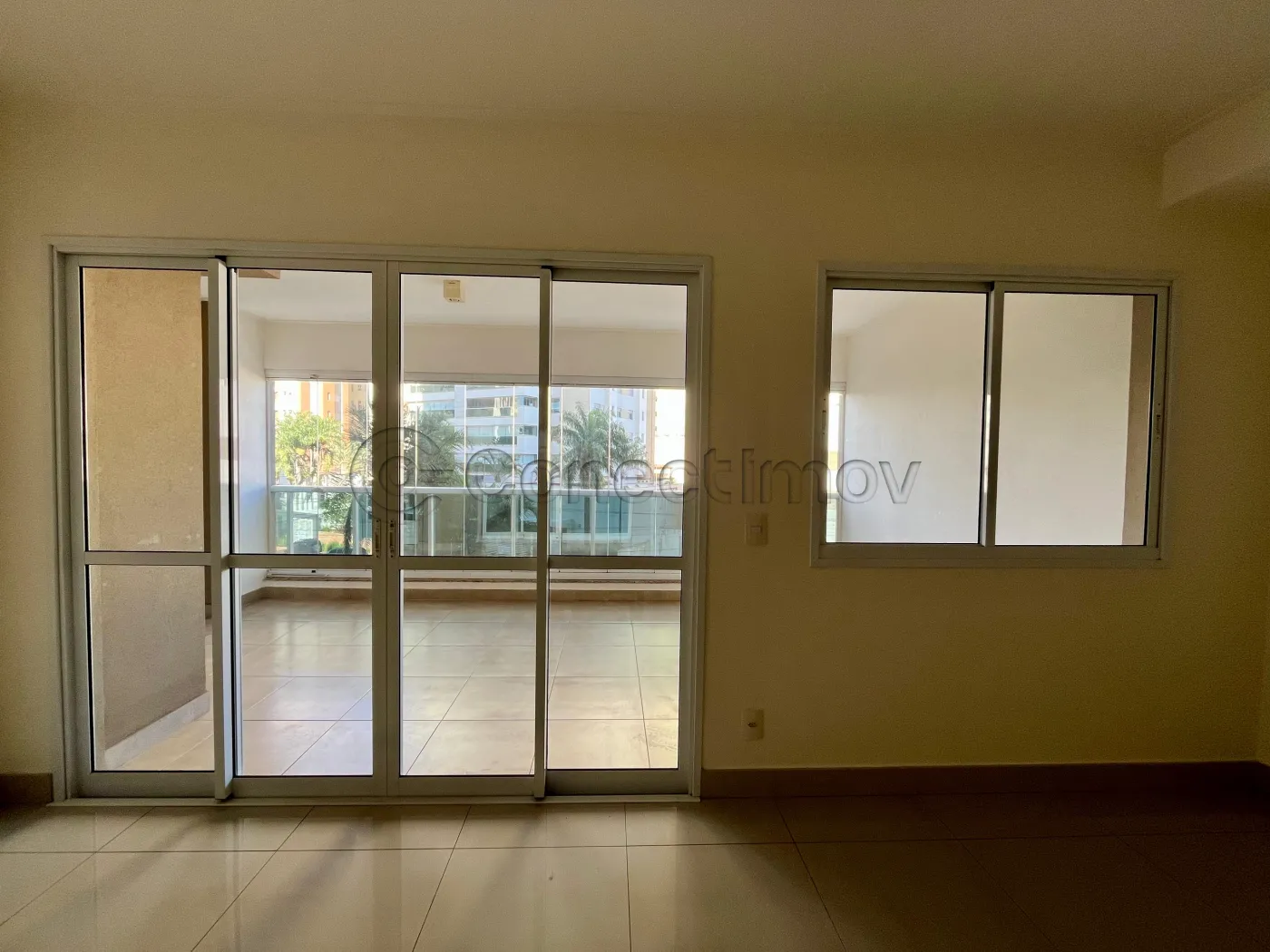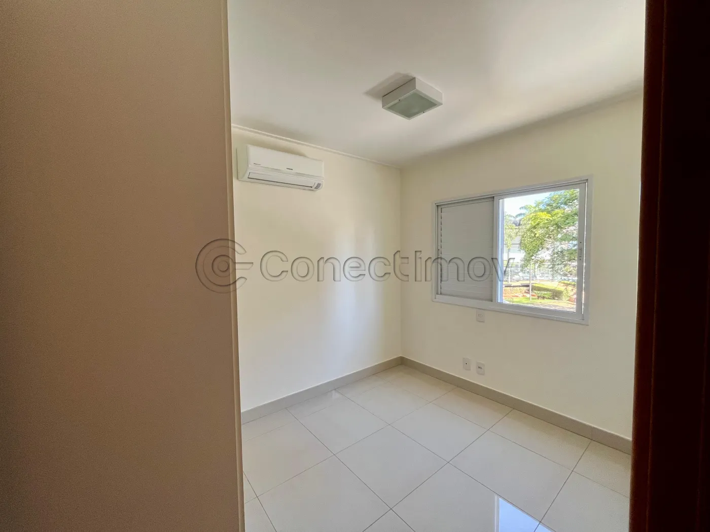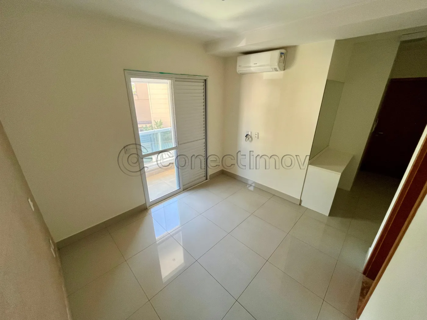 Sala ampla com ar-condicionado e sacada oferecendo uma vista encantadora e ambiente fresco