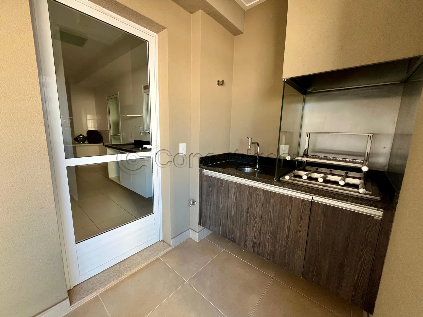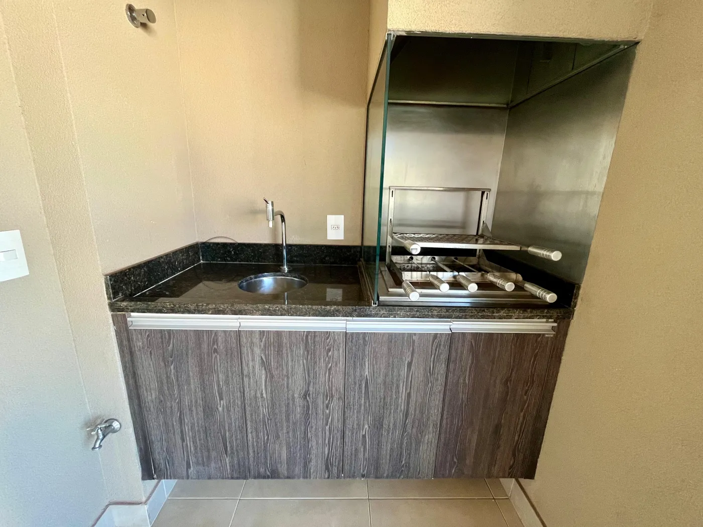Área gourmet na sacada com churrasqueira, perfeita para momentos de lazer e convivência