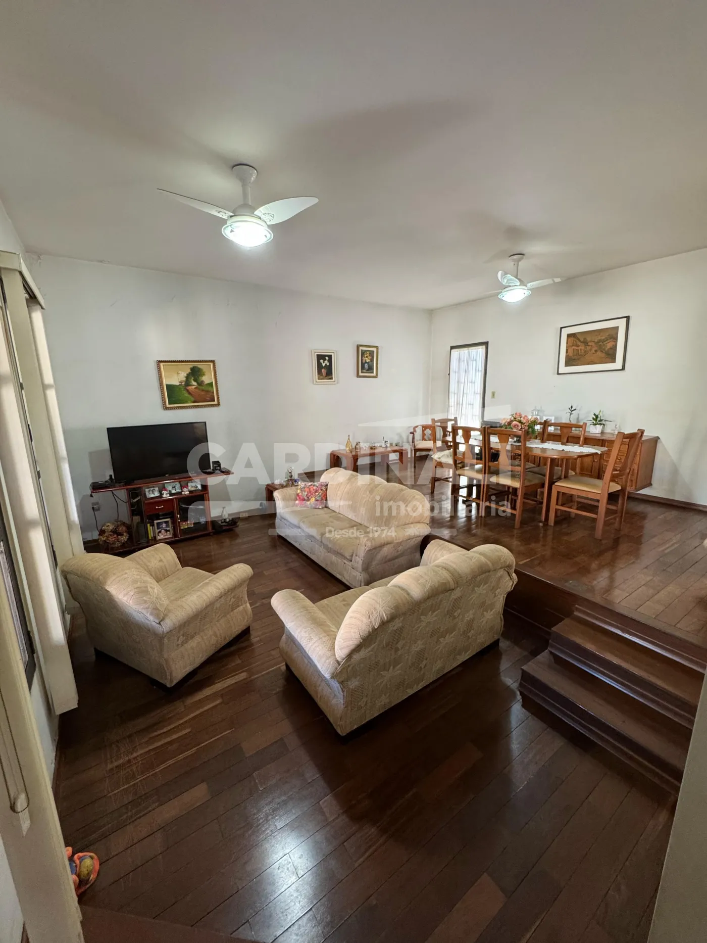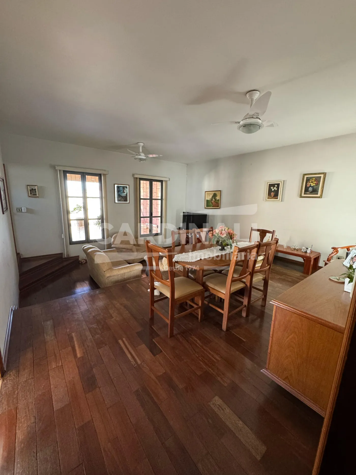 Sala ampla em dois ambientes, possibilitando recepções confortáveis.