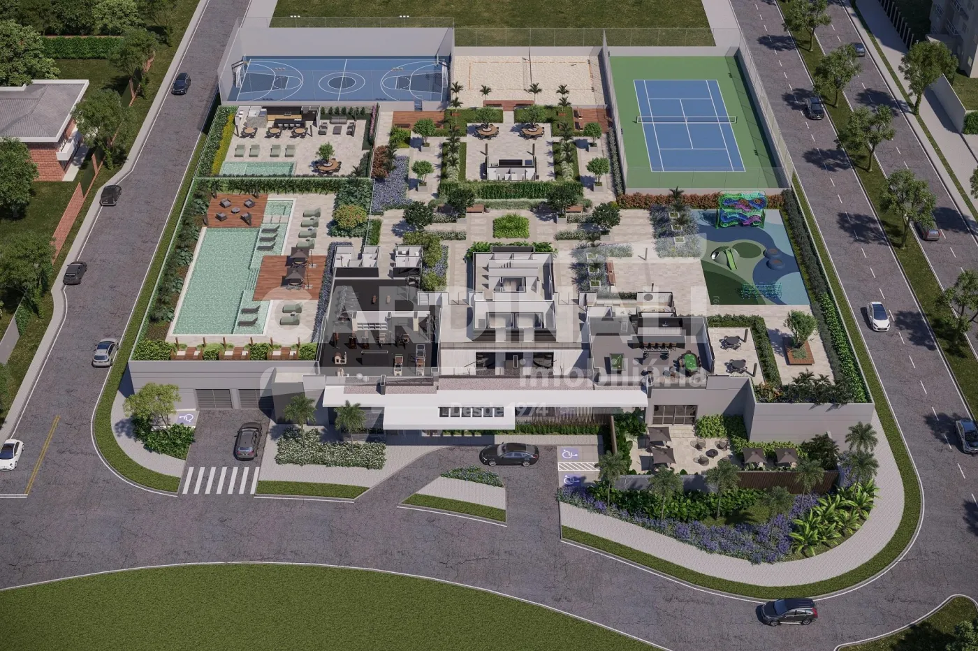 Áreas de lazer completas, incluindo piscina e quadras esportivas, proporcionando diversão e bem-estar