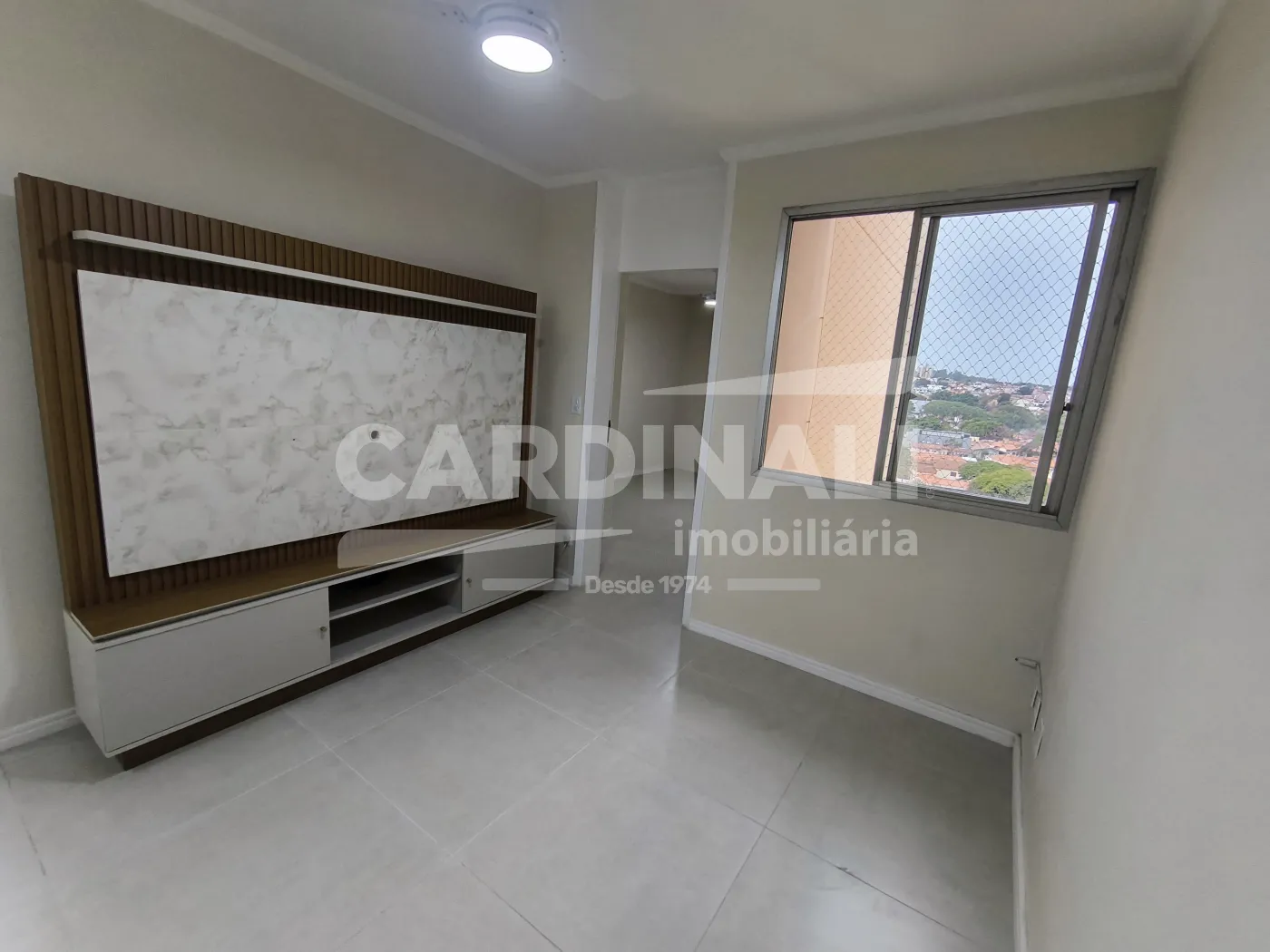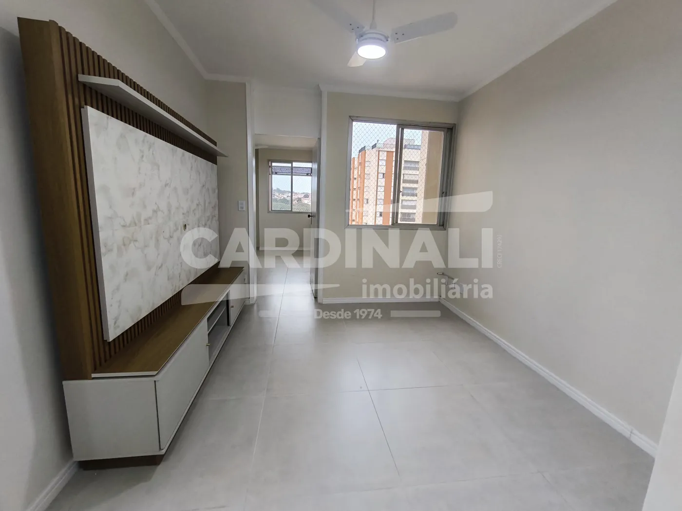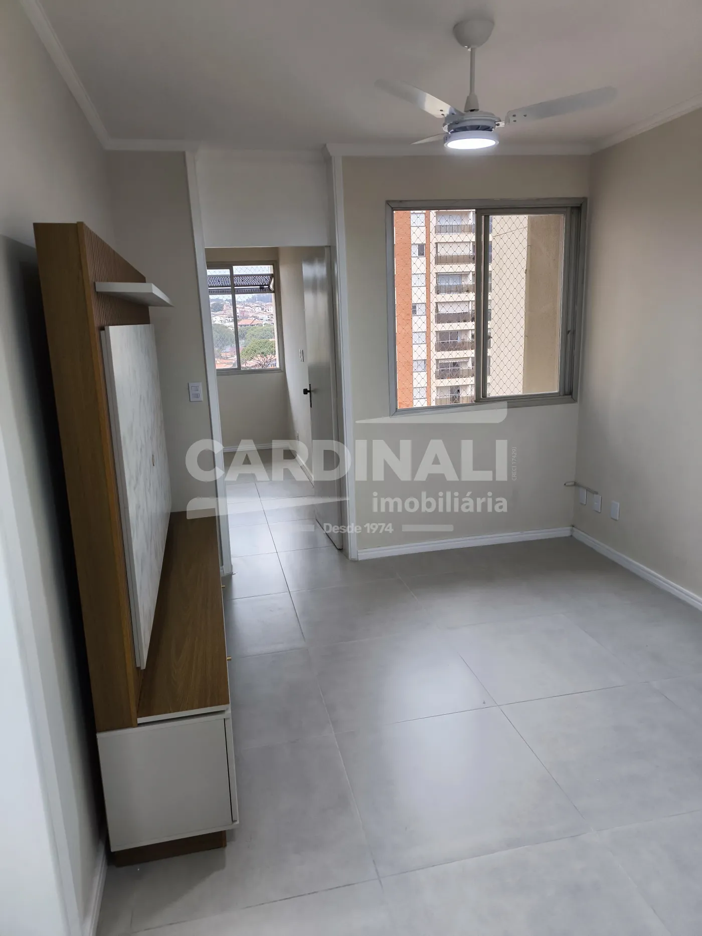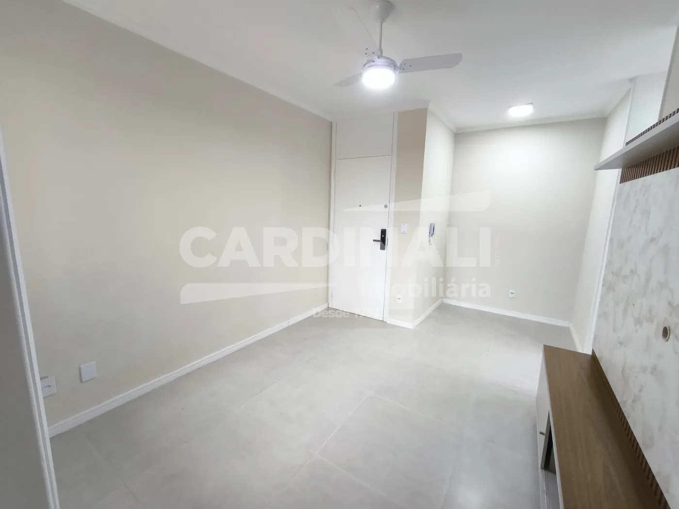 Sala com acabamento em porcelanato oferecendo um ambiente refinado