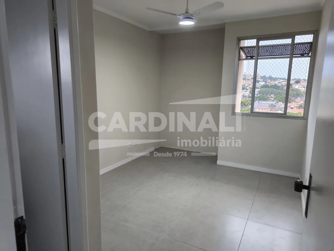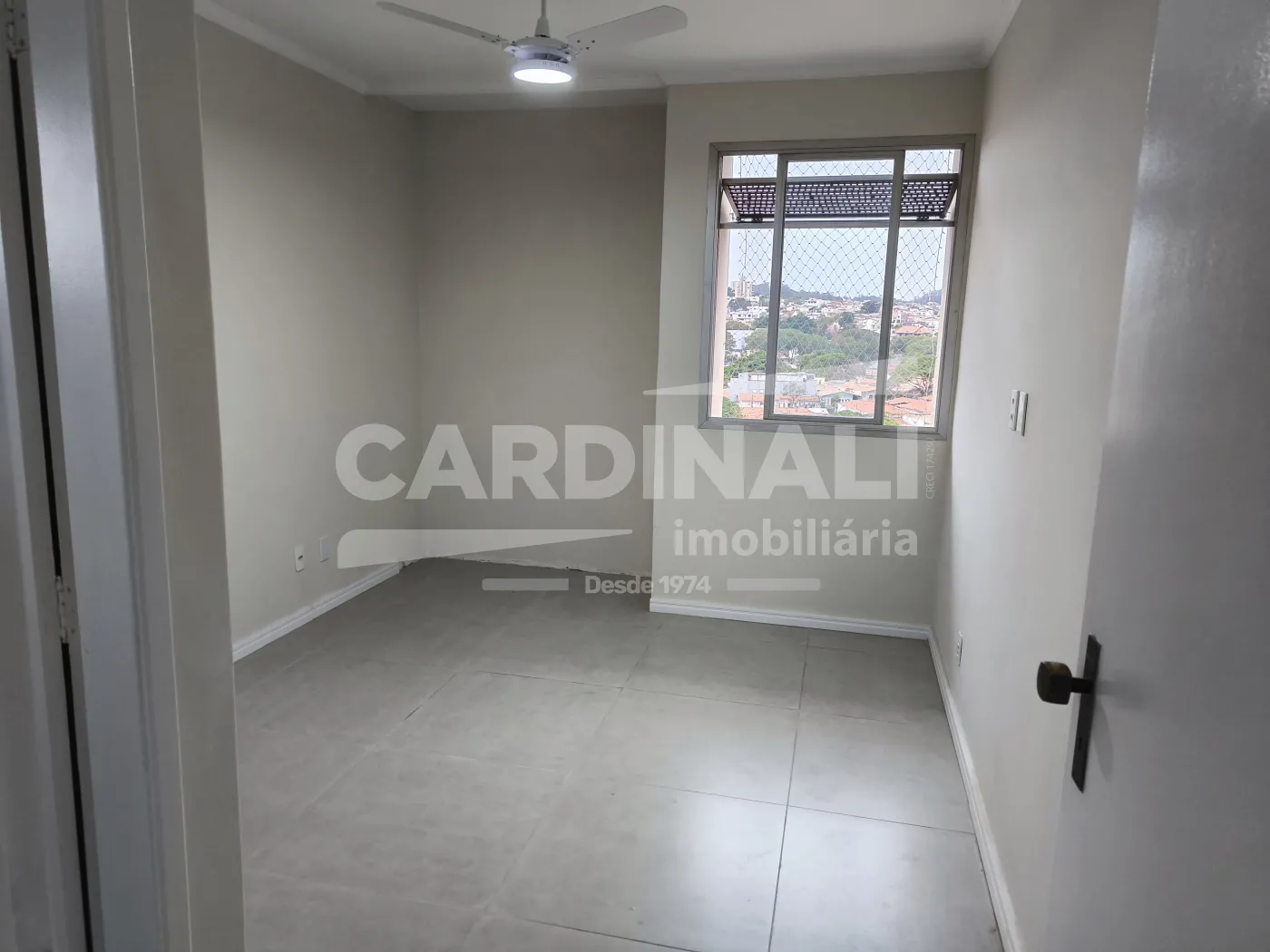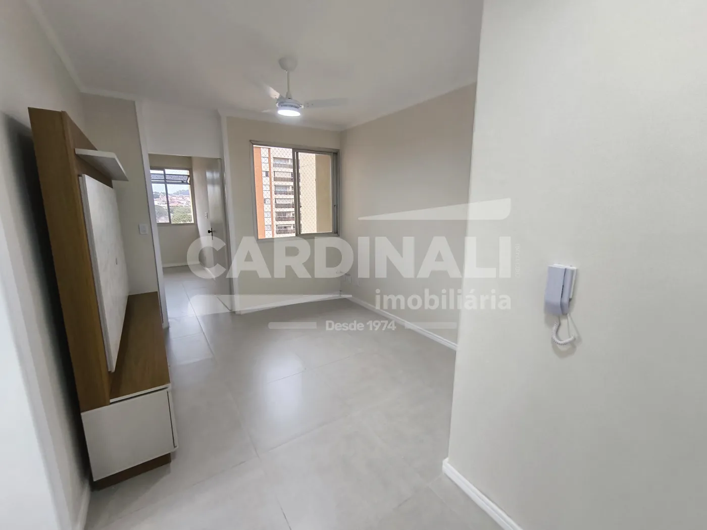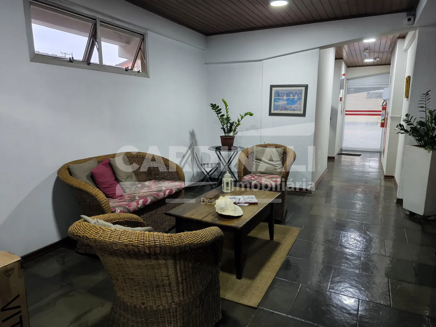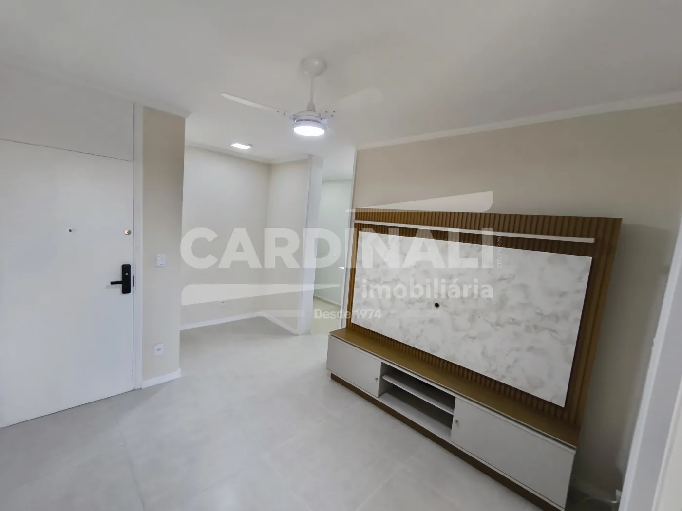 Sala com acabamento em porcelanato oferecendo um ambiente refinado