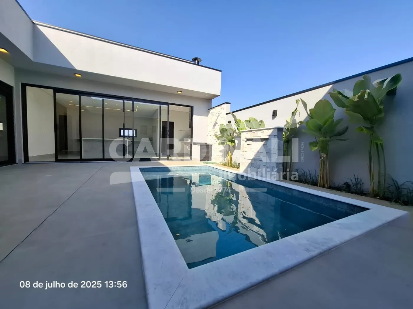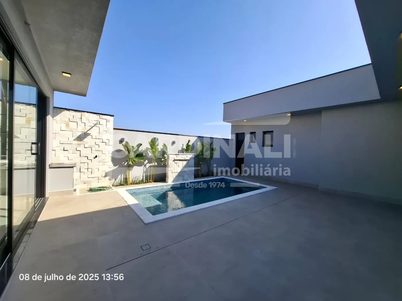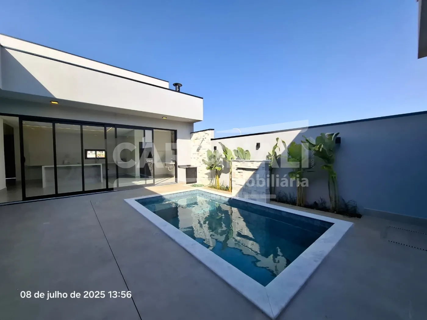 Piscina com cascata e infraestrutura de ponta, incluindo energia fotovoltaica, oferecendo sustentabilidade e economia