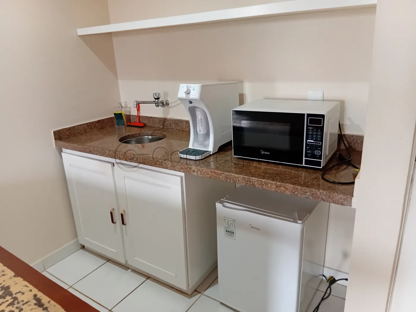 ? Copa equipada com gabinete, frigobar e micro-ondas trazendo praticidade para suas refeições