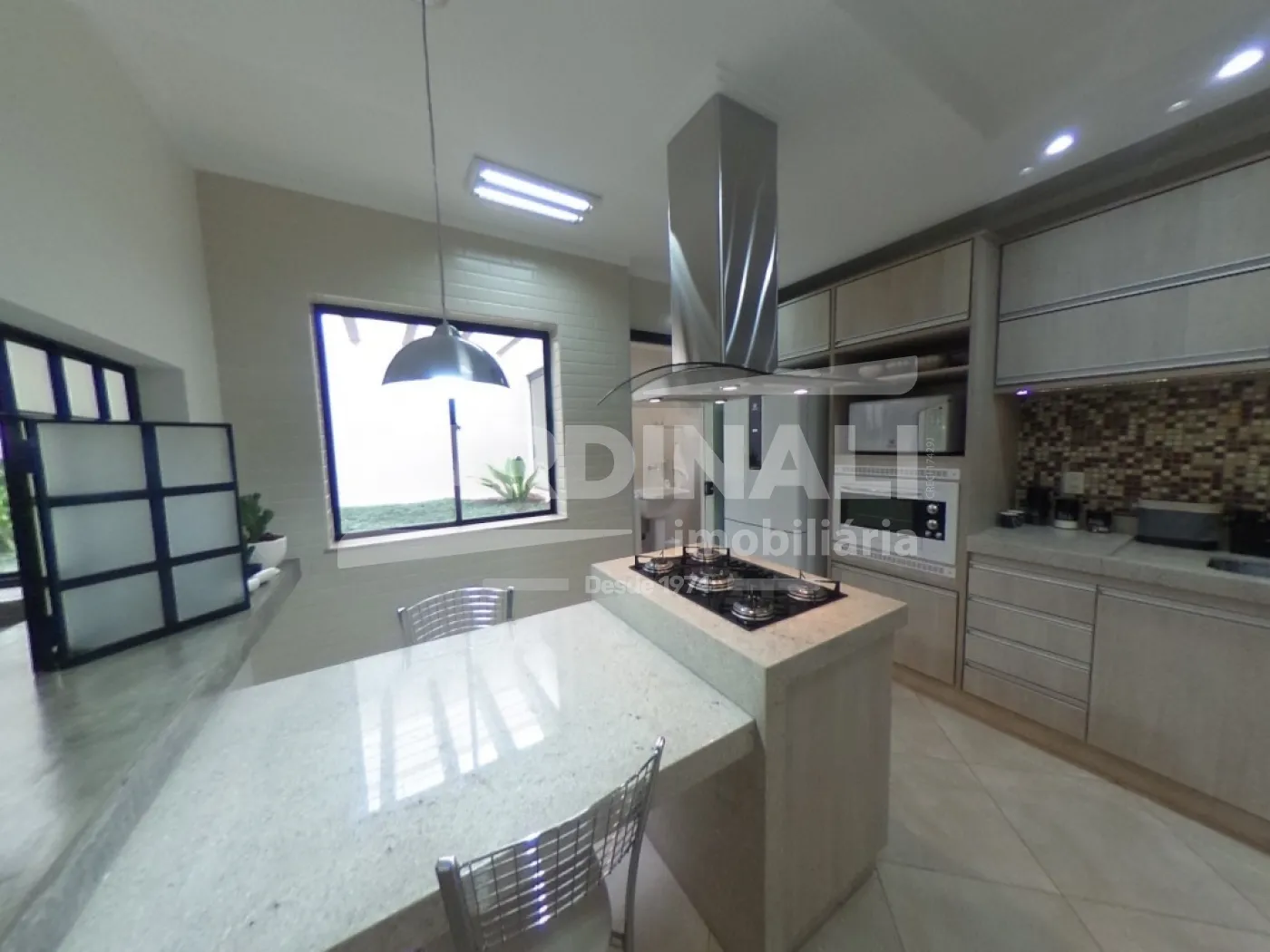 Sala de jantar integrada à cozinha com ilha, oferecendo um ambiente amplo para refeições e convívio